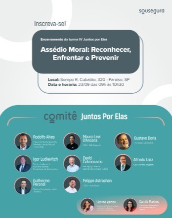 Está marcado para o dia 23 de setembro (terça-feira) o encerramento da Turma IV do "Comitê Juntos Por Elas", consolidando mais um ciclo de desenvolvimento e transformação. Iniciativa da Sou Segura, o comitê, que foi criado em 2021, reúne executivos e líderes homens em torno da equidade de gênero no mundo corporativo.