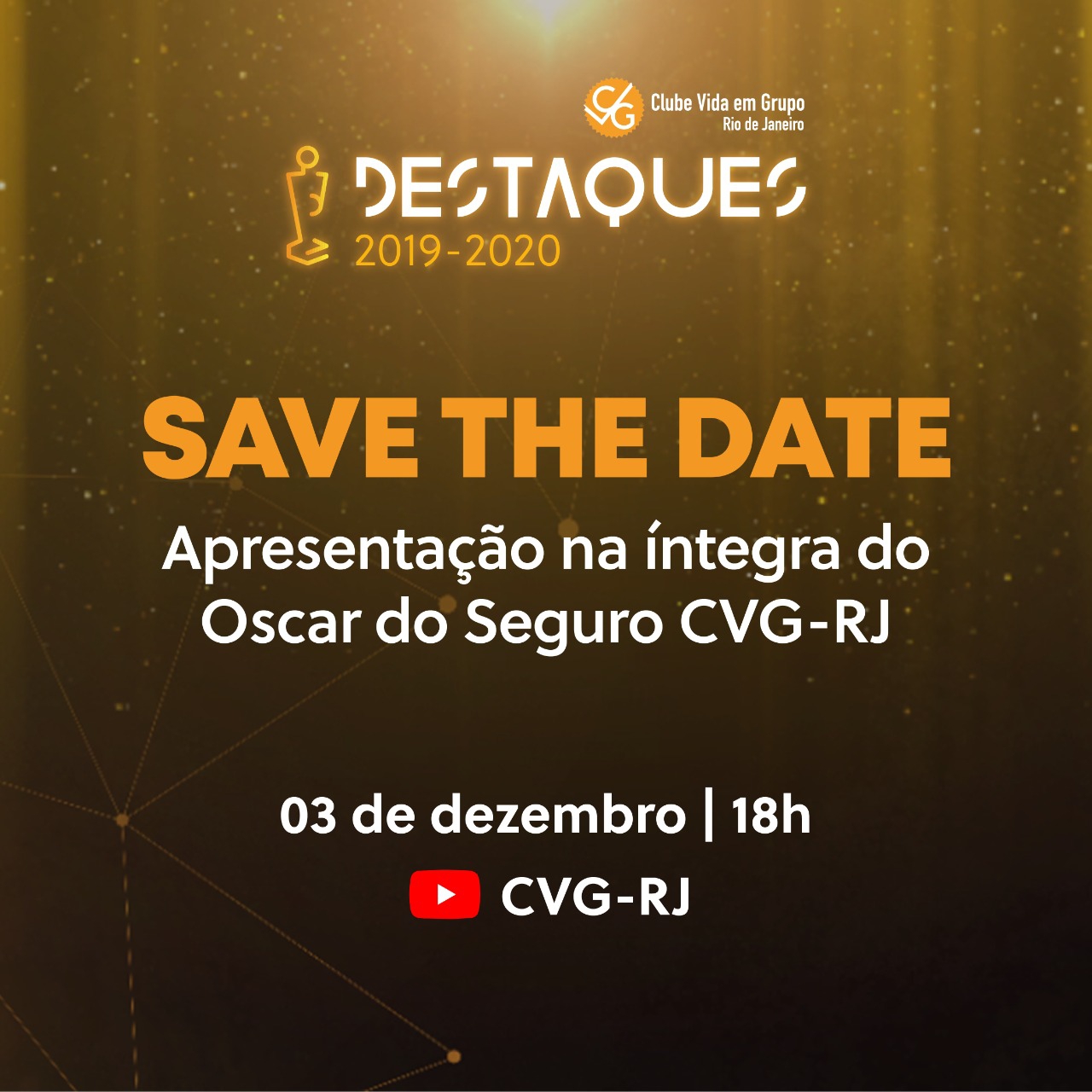 O evento completo do “Oscar do Seguro”, do CVG-RJ, será exibido nesta quinta-feira, dia 03 de dezembro, às 18 horas, no canal do CVG-RJ (Clube Vida em Grupo do Rio de Janeiro) no Youtube, neste endereço eletrônico: https://www.youtube.com/channel/UCxyAwHTjmAZKy05J3kecbAA/